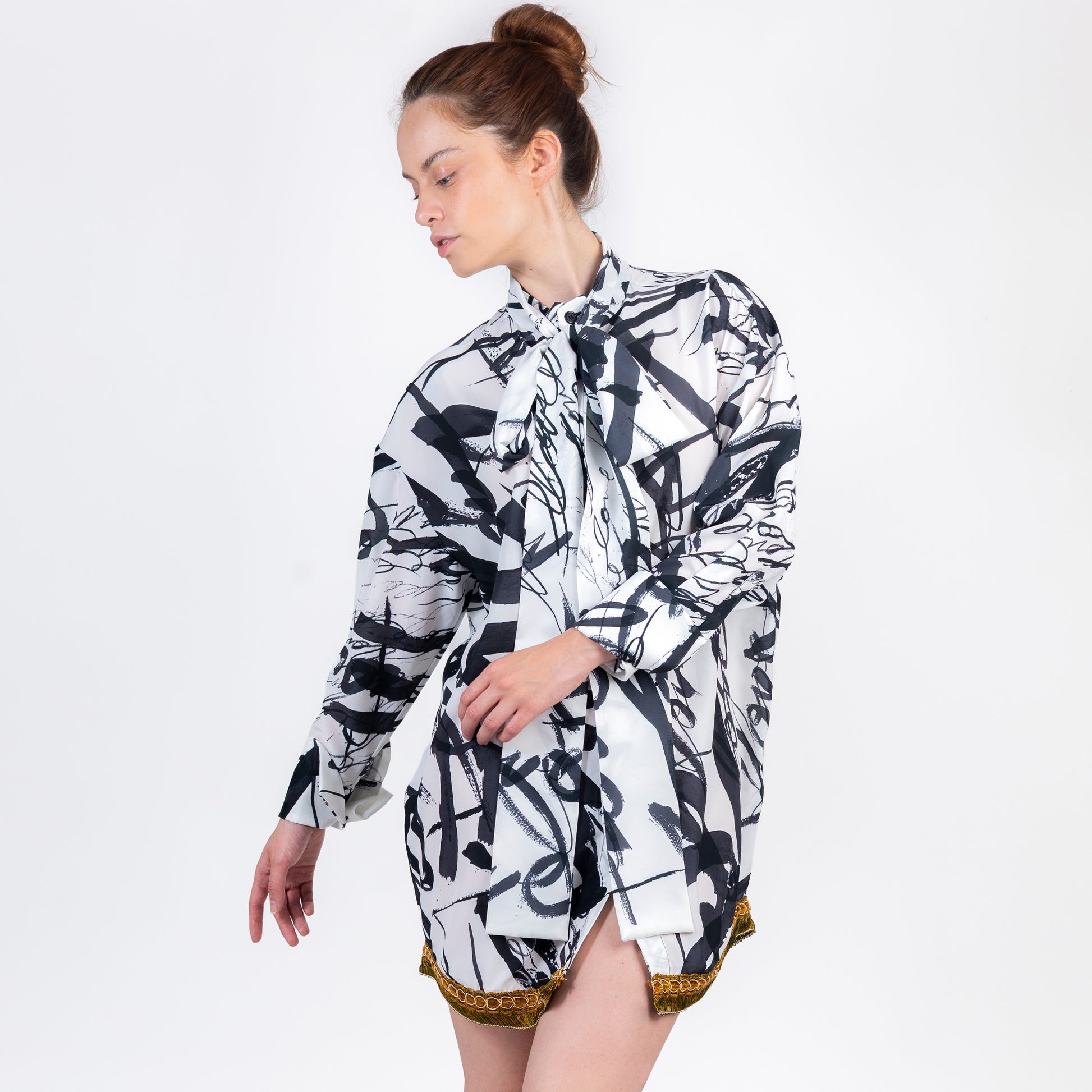 Creada como una pieza de excepción, esta camisa de seda se lee como un lienzo contemporáneo. Su estampado en blanco y negro, compuesto de trazos libres y gestos caligráficos, evoca la energía creativa del movimiento y la espontaneidad del trazo artístico.