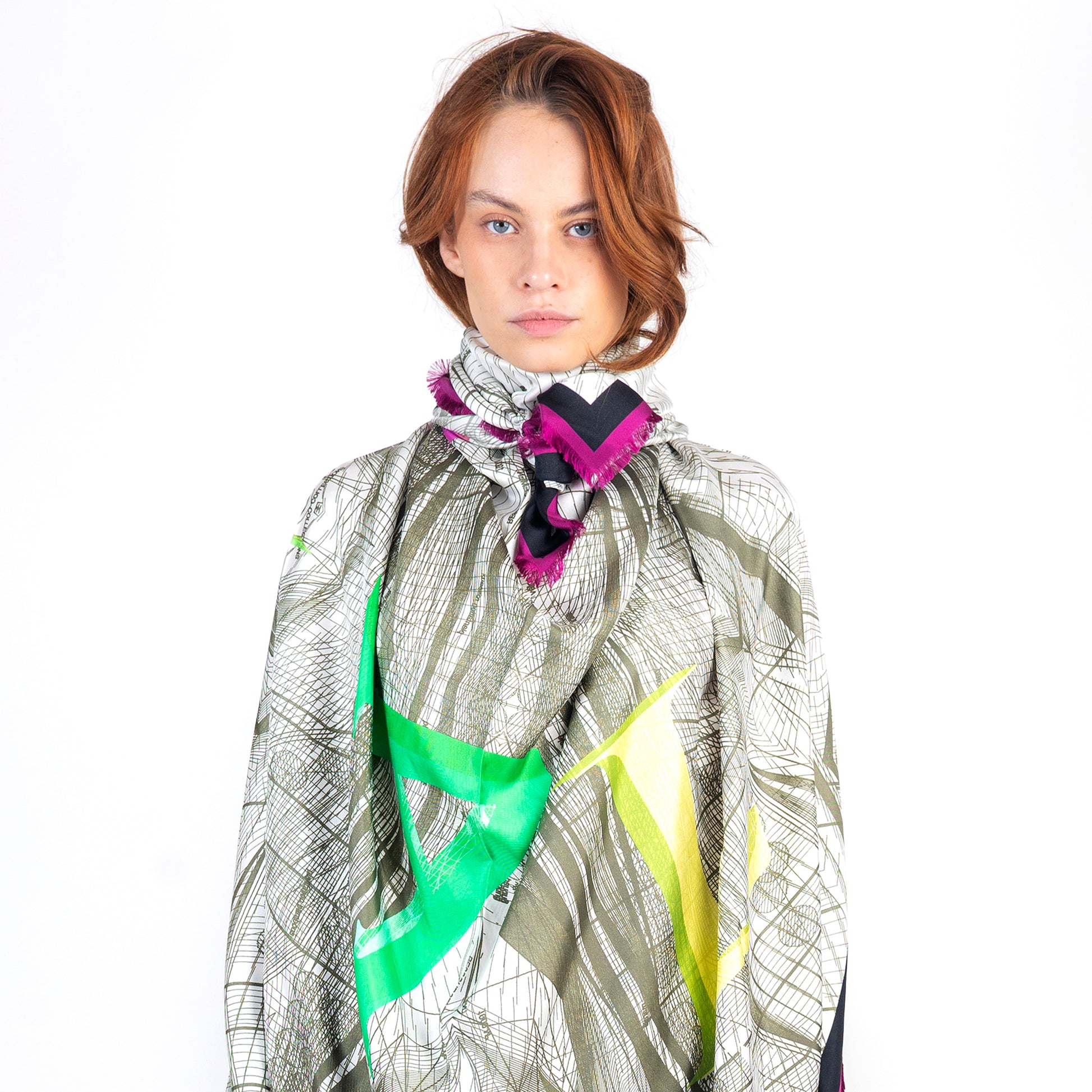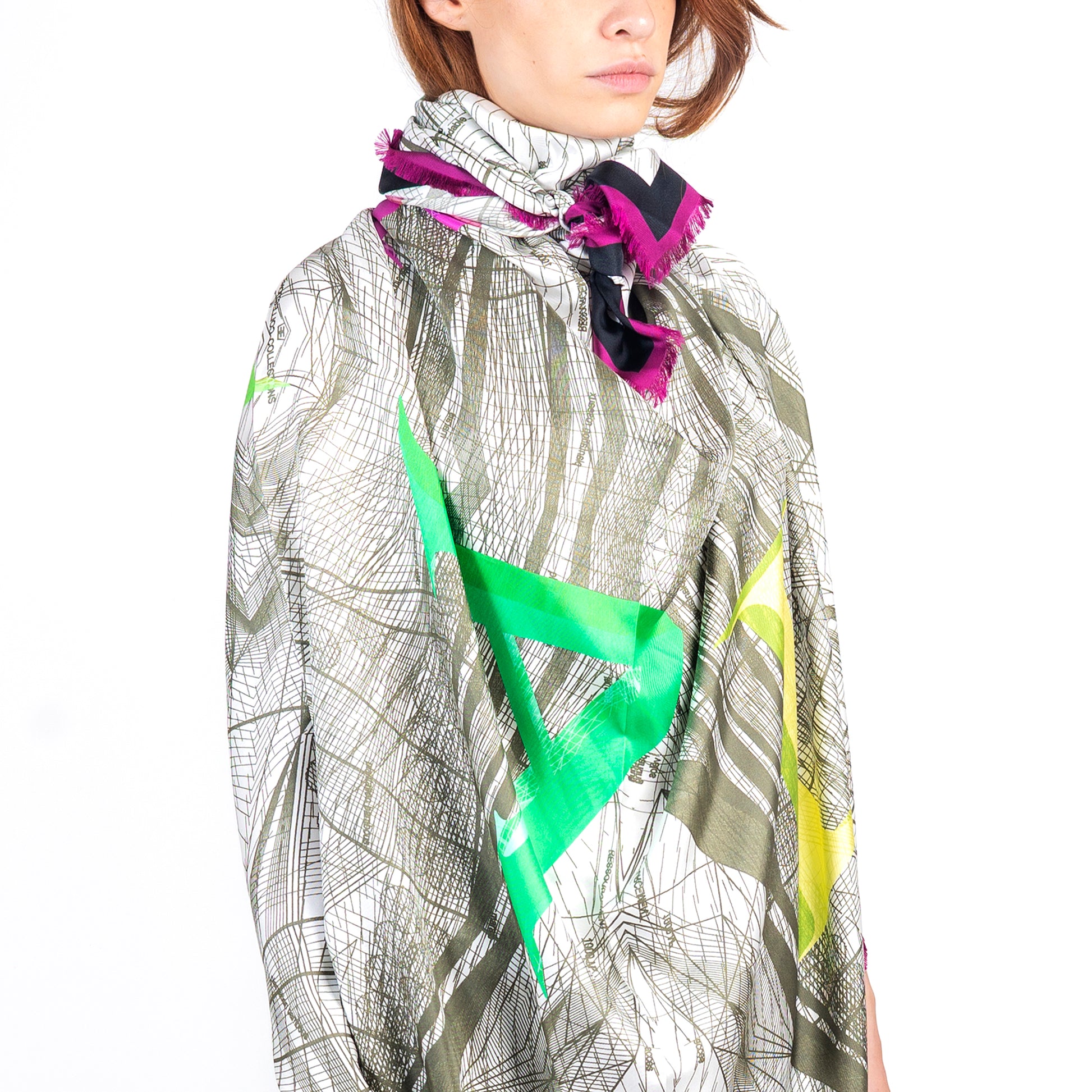 Architecture est la cinquième collection qui revendique son premier amour, l’architecture, à travers une série de foulards particulièrement aboutis, inspirés de ses propres créations architecturales, comme une fantaisie visuelle en trois dimensions qui, au mouvement du corps, évoque une architecture du corps.